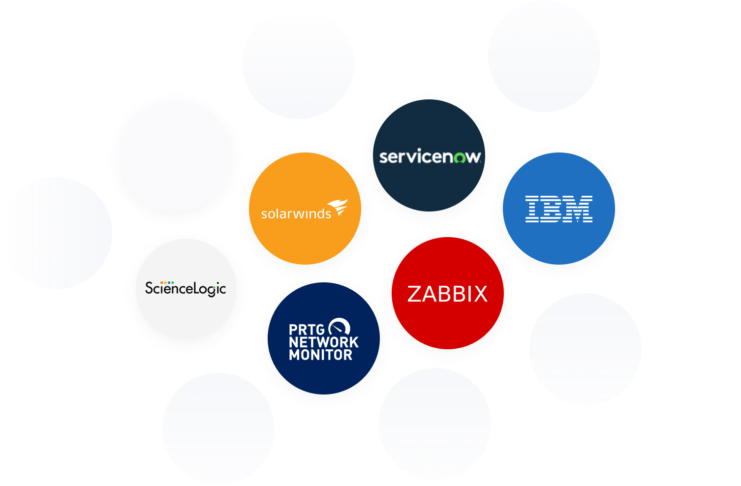 Deploy in 30 minutes with out-of-the-box solutions or less than 10 hours for complex systems. Connect effortlessly to ServiceNow, SolarWinds, IBM Netcool, Remedy, ScienceLogic, and more.